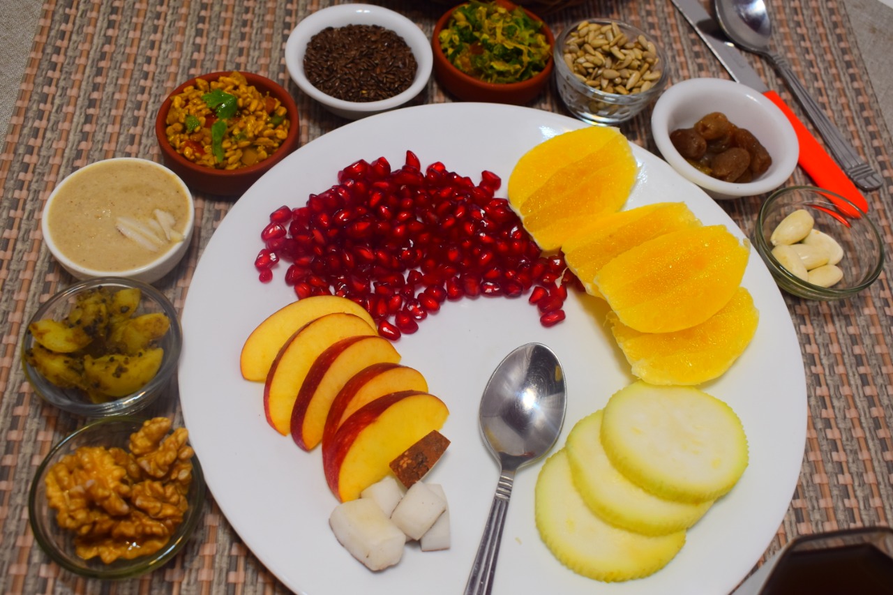 Nritya before the meal enfuses a feeling of celebration in the body, mind and the atmosphere with Hrin Vaayu or positive vibrations. The feeling of joy allows the digestive juices to flow uninstructed in the body thus preparing the body and mind for the meal.