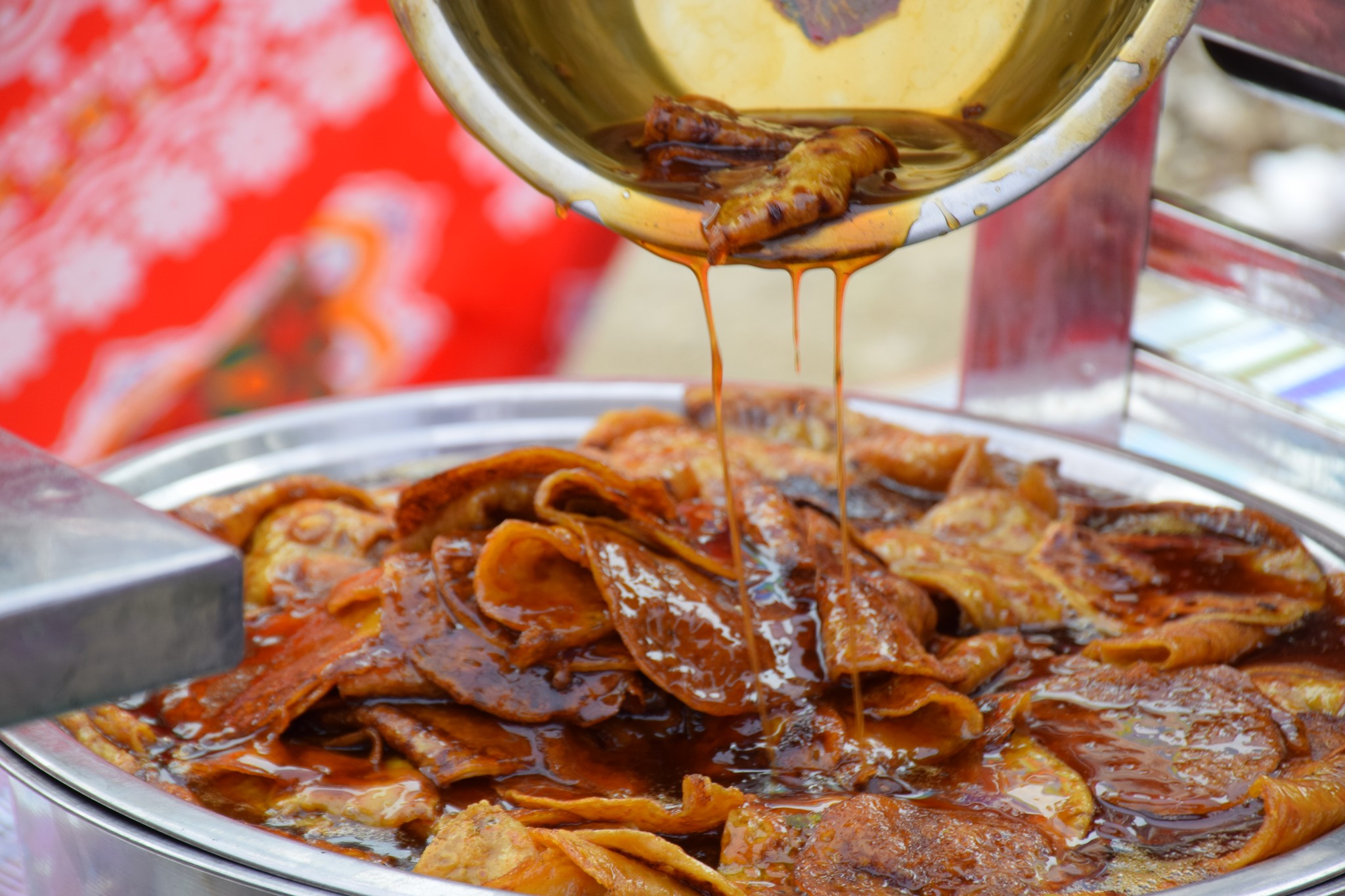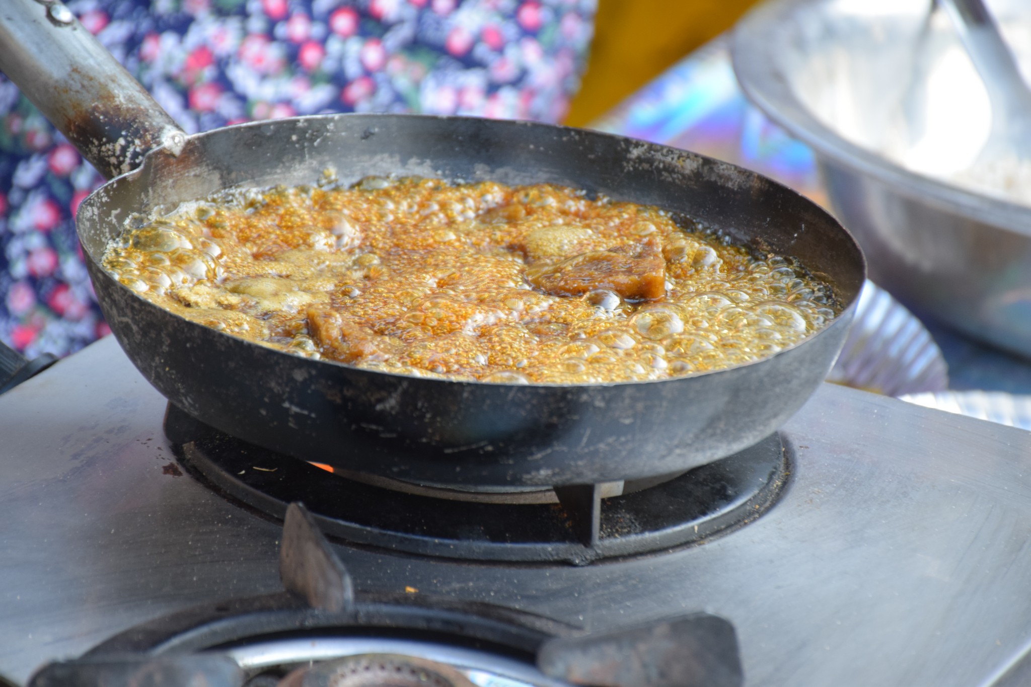 At the end of the meal, a big pinch of turmeric powder mixed with half a pinch of rock salt and cold pressed mustard oil is massaged on the gums and teeth with the middle finger after which the mouth is rinsed well with water and the water too is taken in.