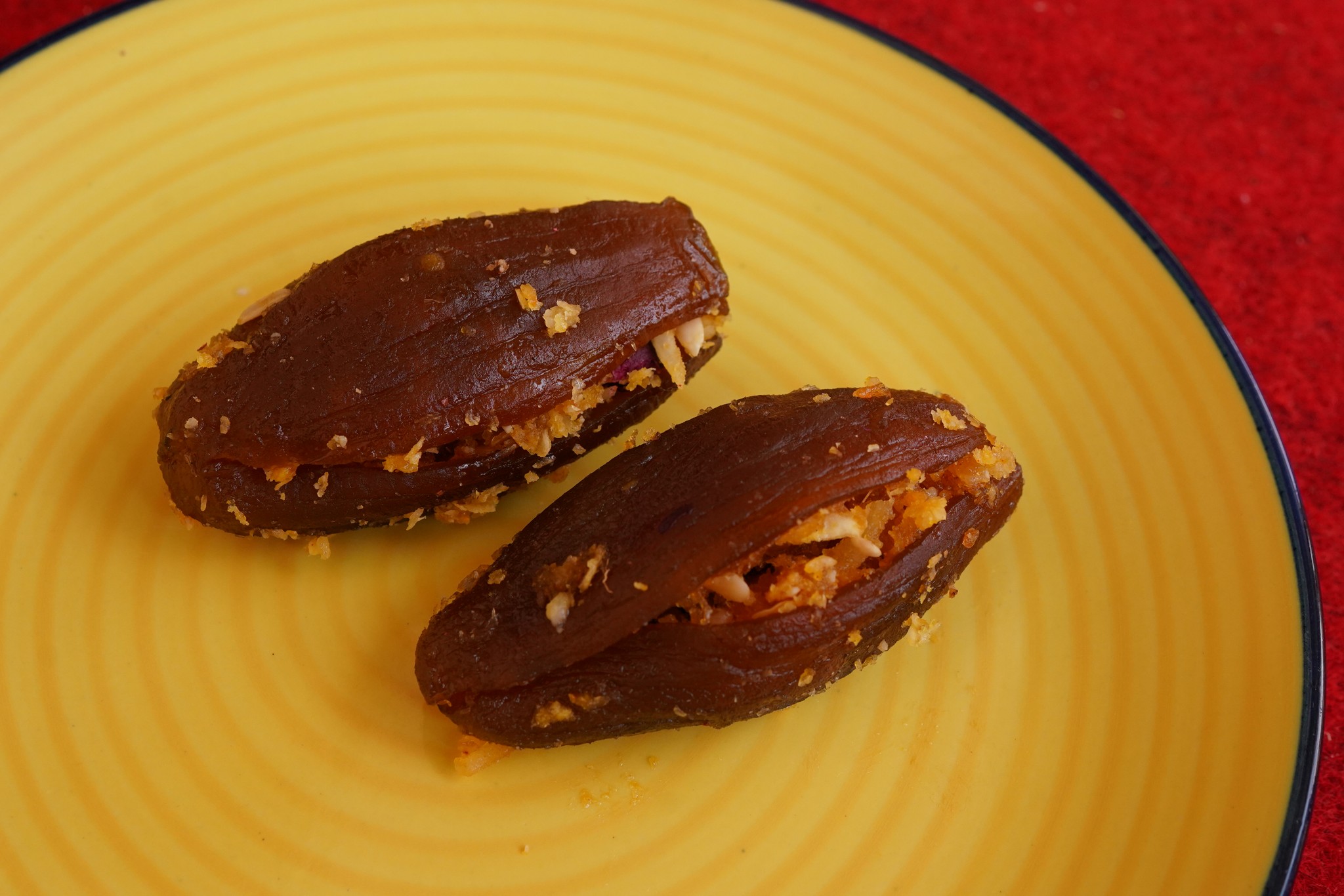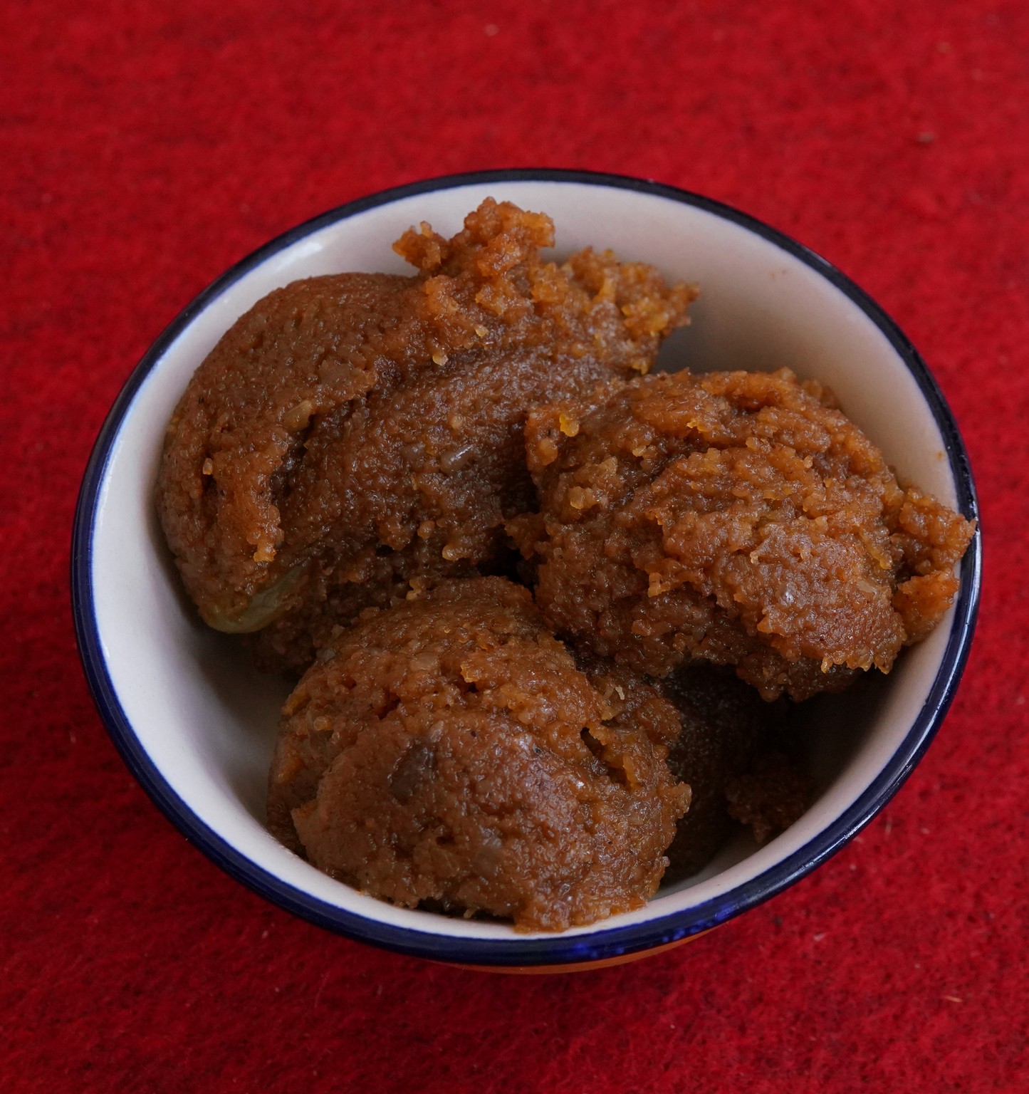 The plate is placed on a stool at navel height. With spine upright, each morsel is chewed appropriately with joy before it is taken in.